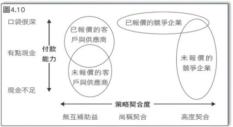 雖然問題只有兩個,好像可以用2x2矩陣,但是答案可能會是落在「區間」,因此並不適合使用區隔嚴謹的矩陣來呈現。比方說,某競爭者的報價剛好落在「好」 和「普通」的中間,既不能畫歸為「好」,也難以畫歸在「普通」。這時,可以改用「泡泡圖」(cluster chart),像圖4.10一樣,以橢圓或圓形來表示對象的範圍。