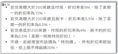 圖4.16這張投影片說明了給顧客多少折扣,是以交易金額高低、特定日期,或是付現刷卡等交易類型來決定。