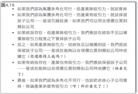 大部分的老闆都沒耐性消化這些,他們會說「這些說明就不必了,直接給我答案──你建議哪個?」萬一與這項議題相關的決策者很多,而且有人覺得多角化不好,有人覺得很好;有人覺得會有綜效,有人覺得沒有,你該怎麼辦?要如何提出建議。